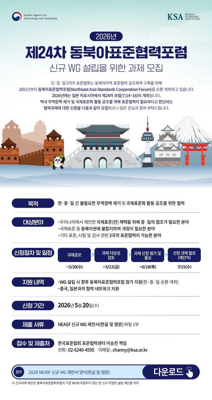 | 제목 | 공지 | 제24차 동북아표준협력포럼 신규 협력과제(WG) 모집/~5/20(수) |