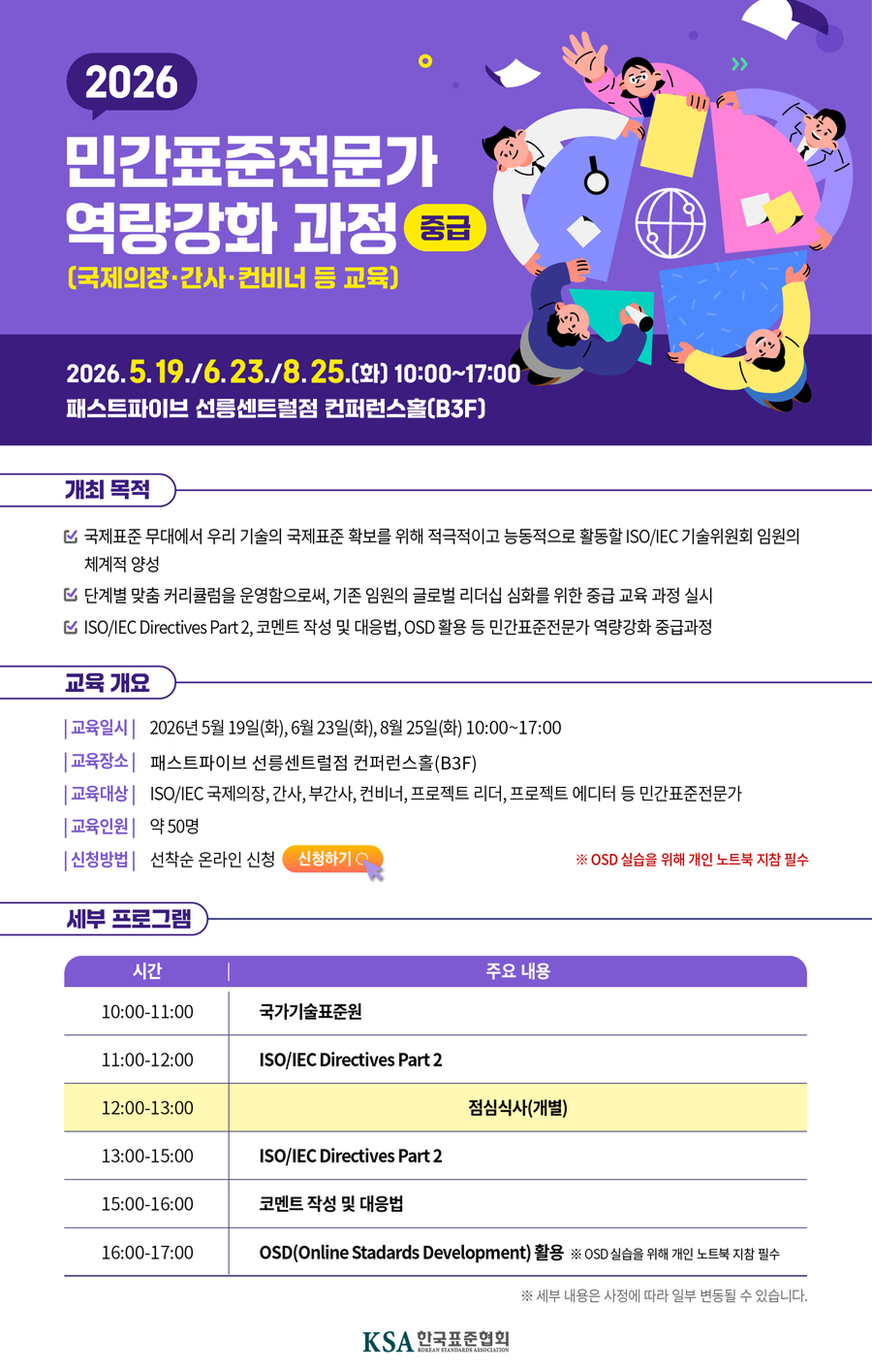 | 제목 | 교육 | 2026년 민간표준전문가 역량강화 과정(중급) 신청안내 |